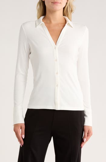 Soft ribbing creates a body-skimming silhouette in this long-sleeve top finished with a classic front-button closure and spread collar.