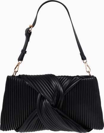 Variegated pleats in knotted formation add texture and dimension to a structured clutch finished with an optional top handle for versatile styling.