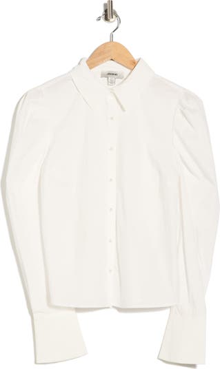Pleated puff shoulders frame this breathable cotton‑rich button‑up finished with pearly buttons.