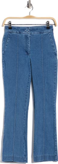 These slim denim trousers feature vertical front seams that create a clean, elongating look.