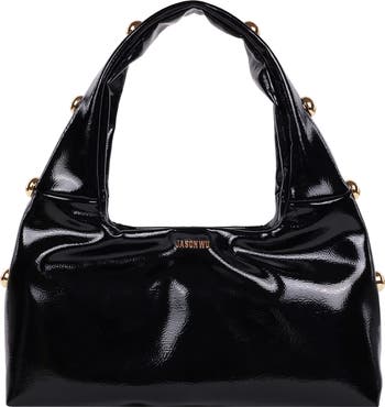Gleaming studs punctuate the sides of a softly structured top-handle bag elevated by a glossy patent finish.