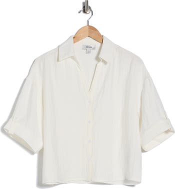 Elevate your weekend ensembles with this flowy button-up shirt fashioned with tabbed three-quarter sleeves.