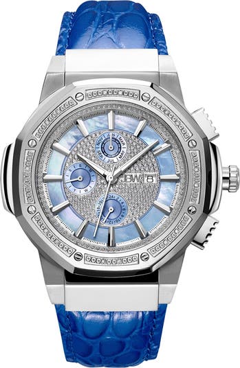 With diamond accents and Japanese multi-function movement, this embossed leather strap watch is both sleek and functional.