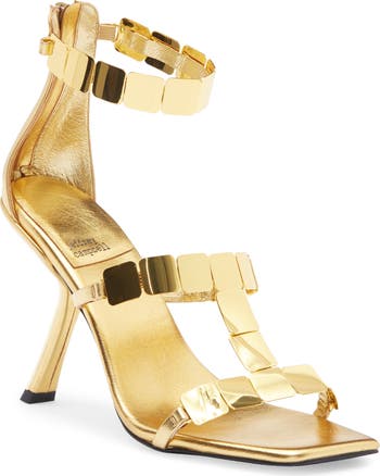Be ready to glimmer at every party in this stunning sandal designed to standout with its metallic finish and architectural spike heel.