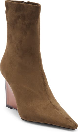A narrow wedge heel amplifies the modern allure of a pointy-toe bootie in a rich faux-suede finish.