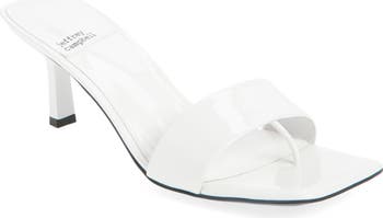 A glossy patent finish and softly squared-off toe amp up the '90s inspiration of this minimalist slide sandal lifted by a low stiletto.