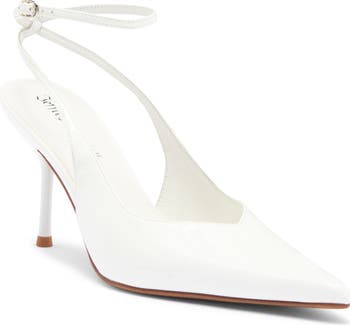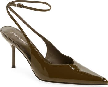 A pointy toe and slender heel balance a glossy pump fashioned with an adjustable ankle strap for a secure fit.