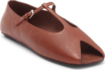 A V-cut peep toe creates intriguing dimension on a streamlined leather flat featuring an adjustable T-strap for a secure fit and retro aesthetic.