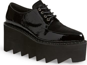 Make an edgy statement in this plain-toe derby soaring on a sawtooth sole and wedge platform.