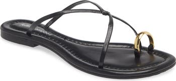A metallic toe loop and interlocking vamp straps create contemporary allure on a leather slide sandal that will complement your trendsetting style.