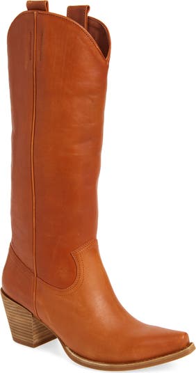 Decorative stitching graces the supple suede upper of a timeless almond-toe Western boot grounded by a chunky stacked heel.