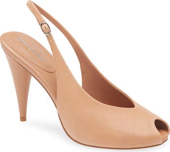 A distinctive peep toe and slender slingback strap create a streamlined profile on an edgy leather pump lifted by a heavily tapered conical heel.