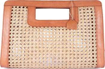 Woven rattan cane brings breezy style to this structured clutch trimmed in smooth leather and finished with easy-to-hold cutout top handles.