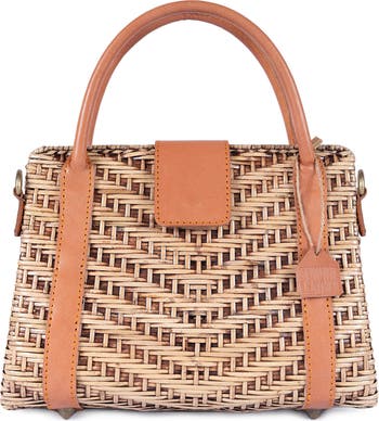 Woven rattan distinguishes this structured top-handle bag trimmed in smooth leather and outfitted with a removable crossbody strap for convenient, hands-free wear.