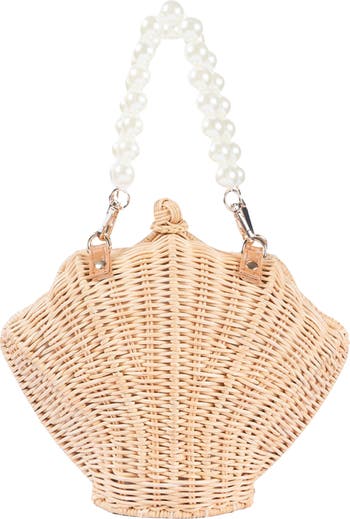 Elevate your ensemble with this exquisite handwoven rattan shell-shaped bag adorned with a striking faux-pearl handle and an optional shoulder strap for a practical finish.