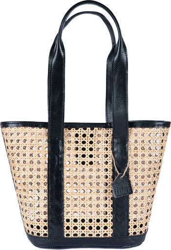 Woven rattan cane brings breezy style to this spacious tote bag trimmed in smooth leather and topped with comfortable shoulder straps.