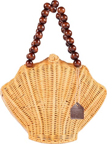 Handwoven rattan in a structured seashell silhouette brings earthy texture to your look in this elegant handbag topped with wood-beaded handles and an optional crossbody strap.