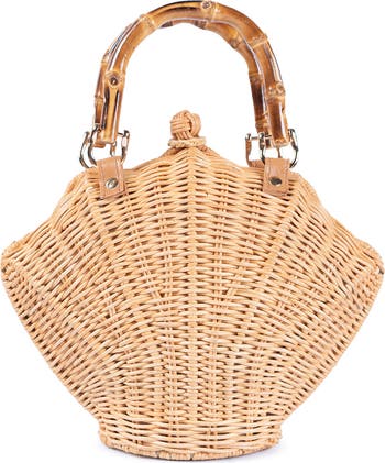Handwoven rattan in a structured seashell silhouette brings earthy texture to your look in this elegant handbag topped with bamboo-shaped handles and an optional crossbody strap.