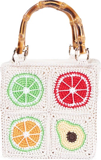 Elevate your ensemble with this fruit-themed, crochet square bag adorned with a knotty-bamboo top handles and an optional shoulder strap for a practical finish.
