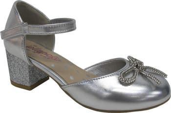 A rhinestone-embellished bow tops the sensible round toe of a party-ready pump lifted by a glittery block heel.