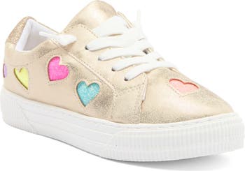 Colorful heart cutouts bring playful charm to a playground-ready sneaker with a cute metallic finish.