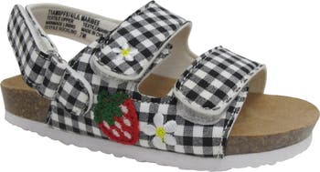 Bright embroidery decorate the vamp of a charming kids' sandal outfitted with a contoured footbed for playground comfort.