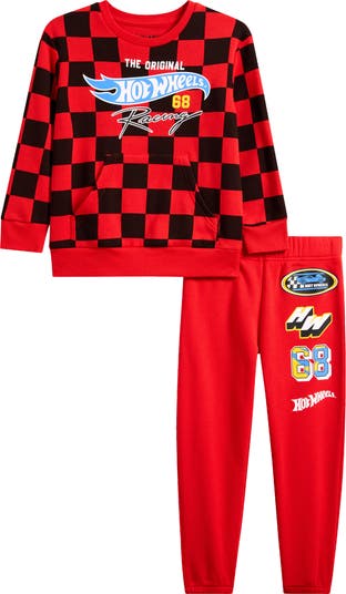 They'll race through the day in comfort with this cotton-rich fleece set—including a checkered sweatshirt and coordinating pants—that's ready to ride with kids who love wheels.