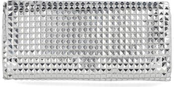 Make a sparkling statement with this magnetic-flap clutch, showcasing a metallic pouch covered with pyrmaid-stud mesh. An optional chain strap provides versatile styling options.
