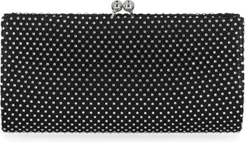 Make a sparkling statement with this dazzling clutch, showcasing a slim silhouette covered with sparkling rhinestones. A kiss-lock top finishes off the glamour of this look.