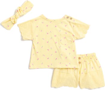 Sweeten your baby's wardrobe with this floral print T-shirt and shorts with eyelet details and a matching headband for the perfect finishing touch.