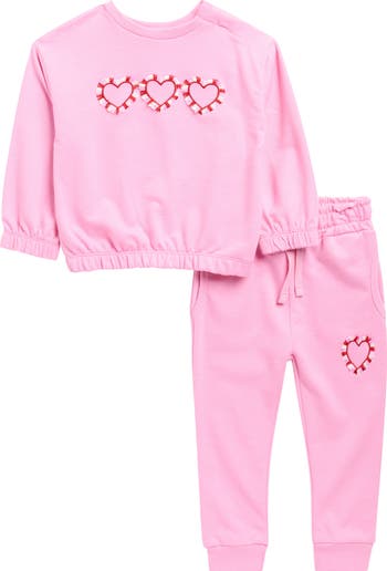 Heart graphics amplify the sweet style points of a matching top and joggers set that are made from French terry for a comfortable fit.