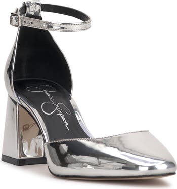 A metallic finish add a striking touch to this occasion-ready pump. A delicate ankle strap and block heel refine the silhouette with effortless sophistication.