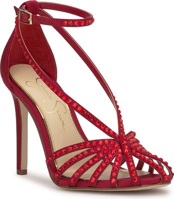 Faceted jewels embellish the slender straps on a soirée-ready cage sandal lifted by a stiletto heel and secured with an adjustable buckle closure.