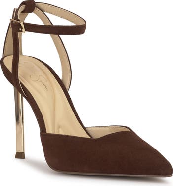 - Adjustable ankle strap with buckle closure; hidden elastic inset