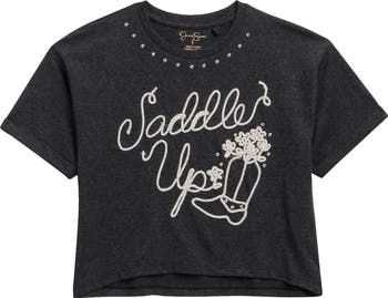 Flowers, butterflies and a smiley-face graphic lend kid-approved whimsy to a crewneck T-shirt cut from a soft cotton blend for laid-back comfort.