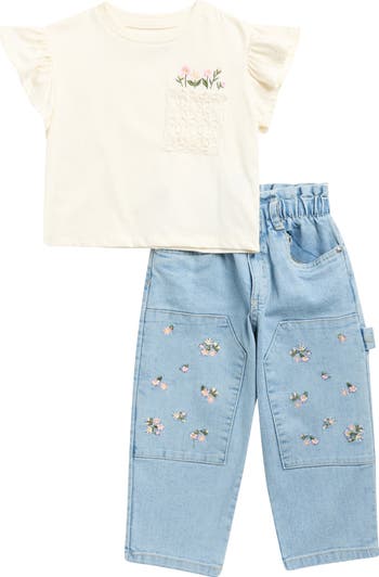 Give your kid sweet style with this soft cotton-blend T-shirt and jeans set decorated with embroidered flowers.