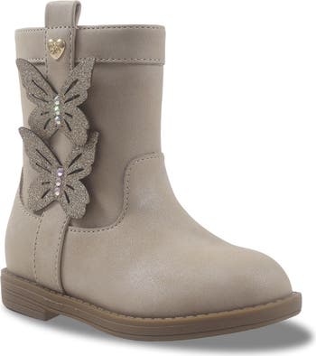 Rhinestone and glitter-finish butterfly appliqués add a whimsy finish to cozy boots your little darling will love to dress in.