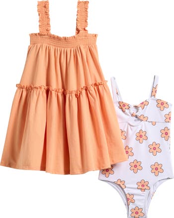 A summery set featuring a ruffled cover-up dress your little swimmer stylish after a long day spent by the beach.