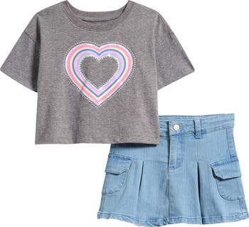 Your tiny trendsetter is ready to hit the party in this adorable set featuring a boxy graphic T-shirt and coordinating pleated-denim skirt.