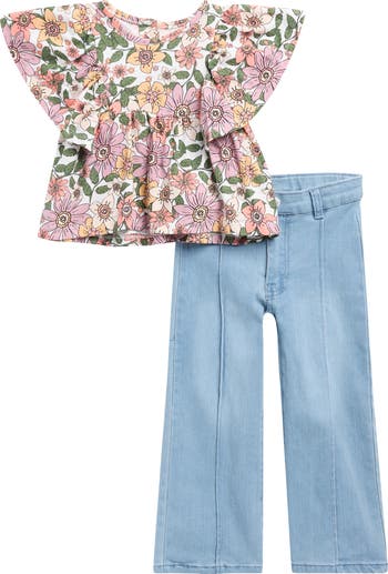 Straight-leg light-blue jeans and a ruffled, patterned T-shirt make a perfect pairing for your kiddo, whether for classroom days or weekend outings.