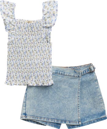 A denim skort has your budding fashionista looking chic and trendy in this set complete with a smocked top covered in ditsy blooms.