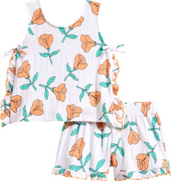 Brighten your kid's day with this crinkled top and pull-on shorts set fashioned with a vibrant print and fluttery ruffles.