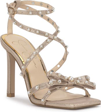 Pearly beads highlight the crisscrossing straps of a lofty sandal that brings an extra bit of glamour to your look.