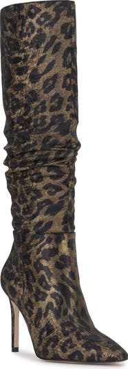 A snip toe and slouchy shaft bring alluring dimension to a knee-high boot lofted by a svelte stiletto heel and fastened with a side zipper.