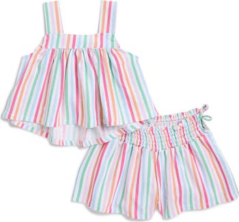 A cheerful stripe print adds playful charm to this spring-ready set featuring a breezy popover top and easy pull-on shorts for a picnic-perfect outfit.