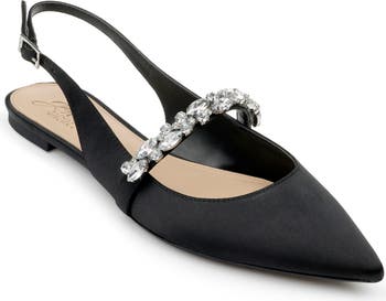 Mixed crystals sparkle along the arch strap of a pointed-toe skimmer flat secured by a slender slingback strap.