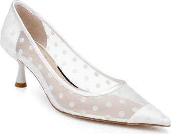 A pointy cap toe and charming polka dot pattern highlight the mesh upper of an occasion-ready pump set on a lightly padded footbed and cylindrical heel.