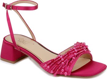 Pearly beads and translucent embellishments saunter over the gathered toe strap on an occasion-ready sandal grounded by a cushioned footbed and wrapped block heel.