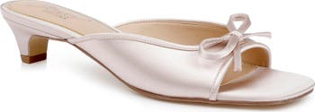 A delicate bow accents the instep of an event-ready slide sandal set on a cushioned footbed and tapered kitten heel for comfortable height.