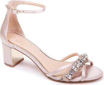 Sparkling crystals embellish the toe strap of an elegant evening sandal. An Art Deco–style embossed plate gleams at the front of the block heel.